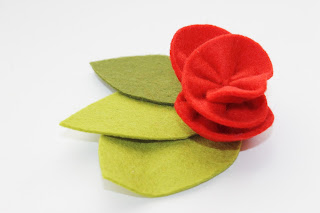 Cut a felt strip, this one for example is 5 x 25 cm, fold it and secure it with pins, then you have to cut small strips along the side it´s folded, without reaching the end. Once the strips are cut we roll it itself while we remove the pins and finally glue the base to the leaves, with hot silicone.