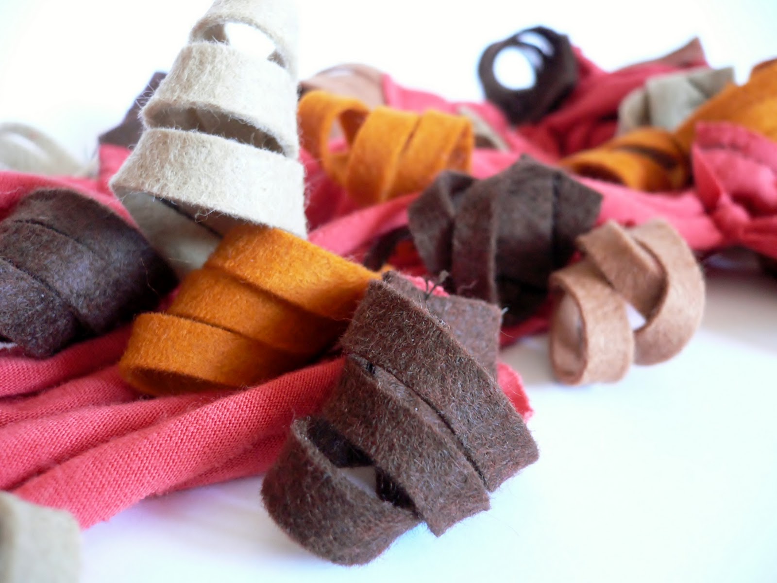 Hace tiempo que compré un montón de fieltro para hacer lo que surgiera, y ya era hora de amortizarlo. Como habéis comprobado por la ausencia de posts, últimamente no tengo mucho tiempo libre. El otro día probando que hacer con el fieltro se me ocurrieron estos rollitos, que son un rectángulo con dos cortes en el centro y doblados sobre si mismos. ¿Que hacer con ellos? ... coserlos a un cordón hecho con tiras de camiseta reciclada. Y la verdad es que aunque sea un collar abriga casi como una bufanda...Os dejo unas fotos abajo del proceso por si queréis probar.