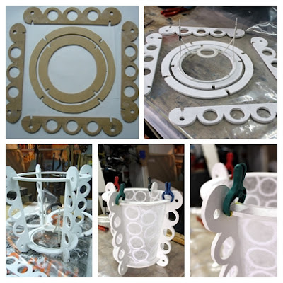 Abajo podéis ver el proceso, son dos piezas circulares y luego 4 piezas iguales para la estructura. El alambre donde va el casquillo es de una antigua lámpara de Ikea. El papel lo he comprado en una papelería que me encanta, de mi antiguo barrio en Madrid que se llama La Riva, donde podéis encontrar un montón de papeles interesantes y para múltiples usos.