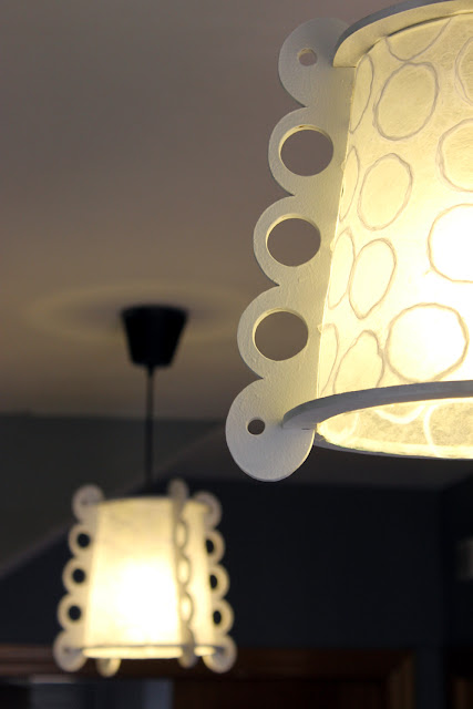 Estas lámparas las ha hecho mi marido con restos de DM, y mucha imaginación (y maña...claro), yo sólo he contribuido a la elección del papel de la pantalla y creo que le va perfecto repitiendo el tema de los círculos...