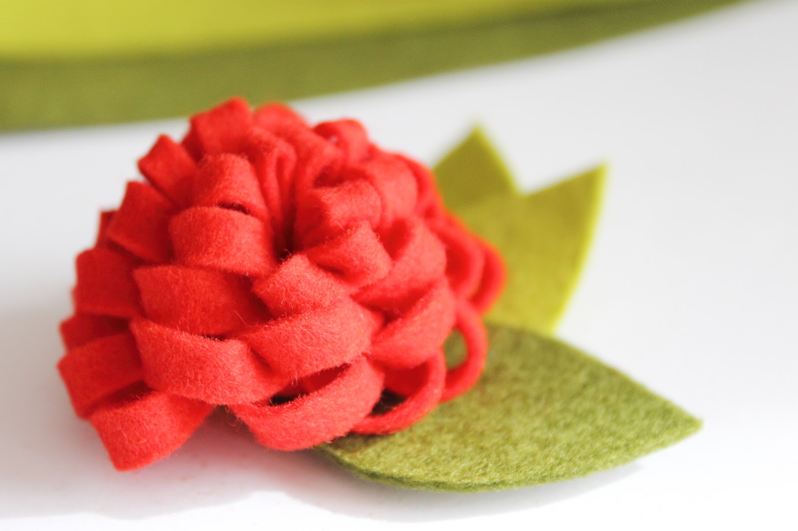 Cut a felt strip, this one for example is 5 x 25 cm, fold it and secure it with pins, then you have to cut small strips along the side it´s folded, without reaching the end. Once the strips are cut we roll it itself while we remove the pins and finally glue the base to the leaves, with hot silicone.